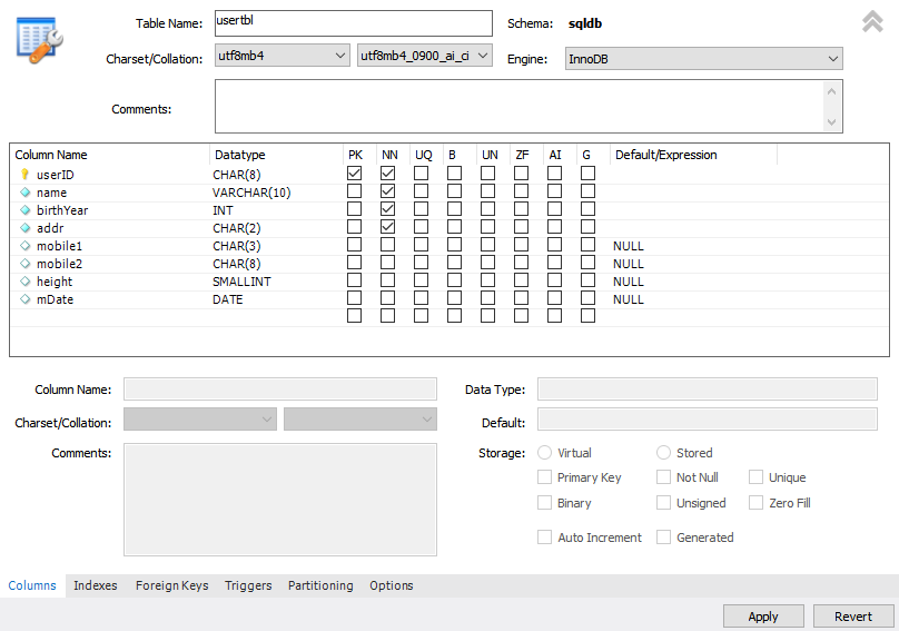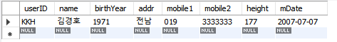 INSERT INTO usertbl VALUES('KKH', '김경호', 1971, '전남', '019', '3333333', 177, '2007-7-7');